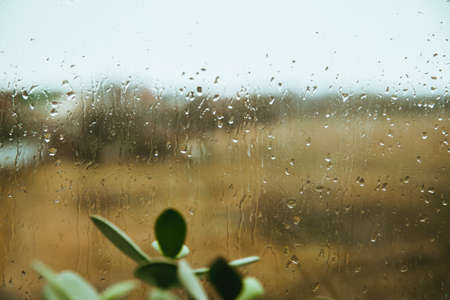 Raindrops on the window. Cloudy weather. Autumn or spring. Background and texture.