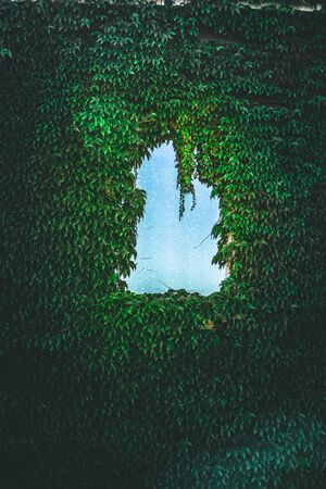 Green ivy leaves surface with a wooden frame and a window on the wall of a building. Decorated with ivy. Green wall of ivy.