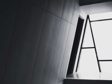 Steel and glass window on gray concrete loft wall of vintage house in vertical frame with sunlight and shadow on surface