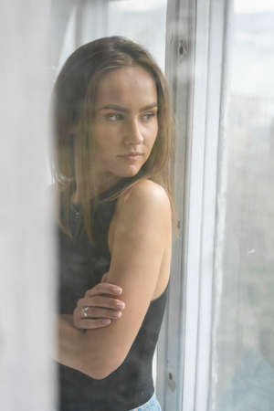 Portrait of young pensive caucasian brunette woman posing in black underwear and blue jeans, standing behind a open window in white studio. Model tests of pretty girl in basic clothes.