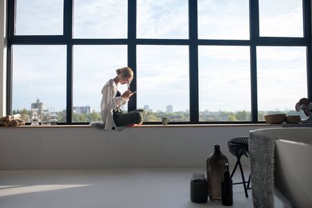 Spacious apartment. Woman texting friend and spending morning at home in her spacious apartment