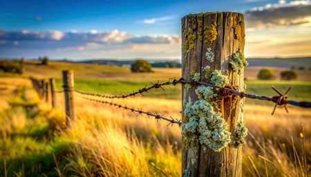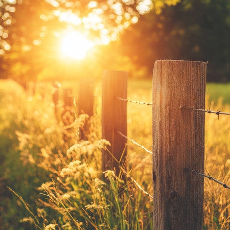 A serene rural landscape showcasing rustic wooden fence posts adorned with barbed wire, bathed in warm sunlight, creating a tranquil atmosphere in golden grass.