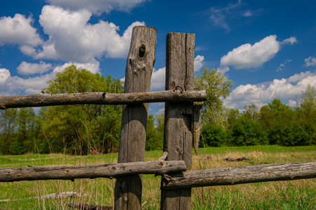 Old wooden fence in the meadow on a sunny day. Spring season in the countryside.