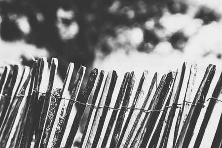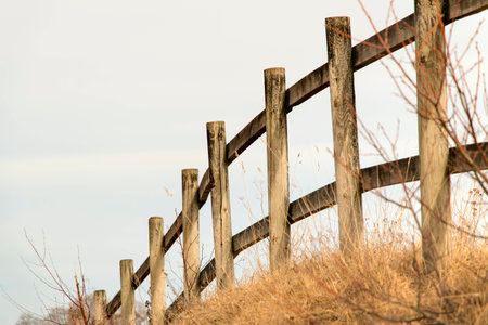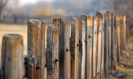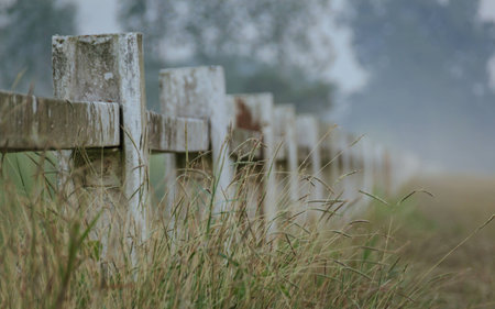 Rustic wooden fence in foggy rural landscape with weathered texture and natural charm