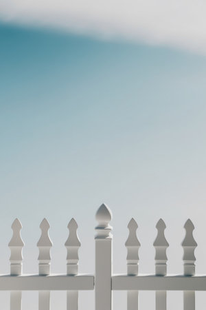 A white picket fence with weathered paint stands against a clear, bright blue sky. The wooden fence panels are all vertical, creating a solid barrier. The sunlight reflects off the paint, creating a soft, diffused light.