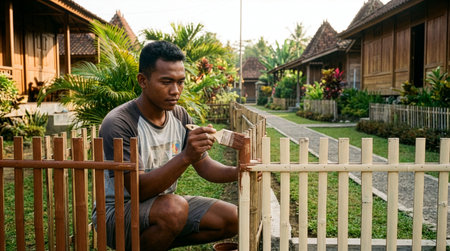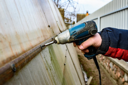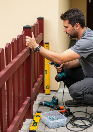 Professional handyman precisely installing wooden fence panels with drill and measuring tools. Perfect for home improvement, construction, and DIY with