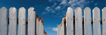 A weathered wooden fence exhibits a jagged edge due to wear and tear, standing against a bright blue sky filled with fluffy clouds, showcasing daylight.