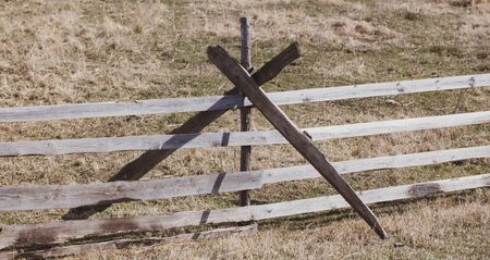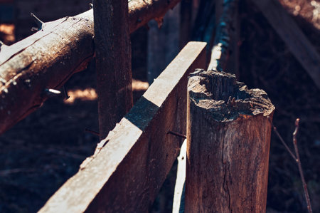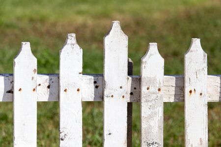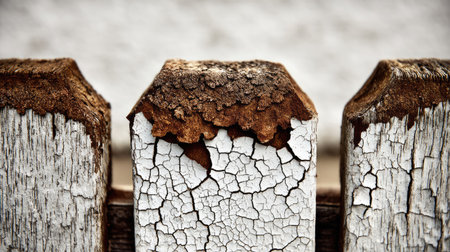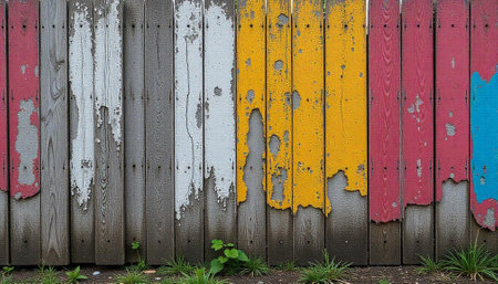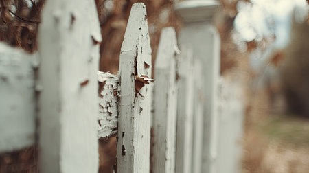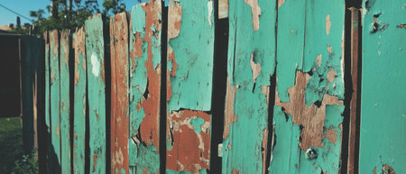 Rustic wooden fence with peeling paint showcases weathered charm in outdoor setting