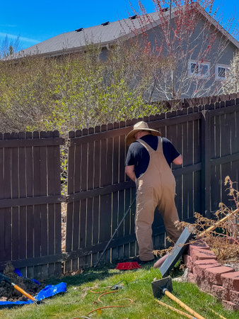 A man wearing overalls and a straw hat repairs a backyard wooden fence using yard tools. This image is ideal for DIY, home improvement, or fence maintenance editorial content.