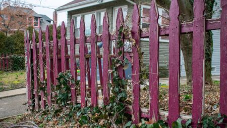 An OId Worn Red Wooden Fence With a House and a Tree in the Background