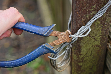 A man holds a rusty wire cutter in one hand, which he uses to cut off white aluminum wire on the street.