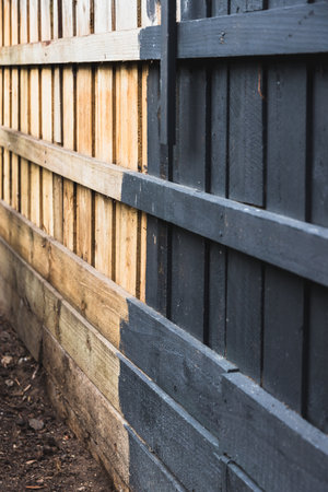 half painted backyard retaining wall or fence, charcoal vs bare wood, home improvement and renovation concept