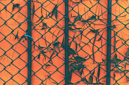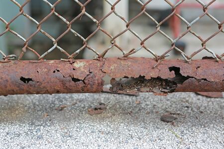 Weathered and old metal fence on a green scenery - Rusty railing with a rough texture and deteriorated surface – Abandoned steel structure used for protection