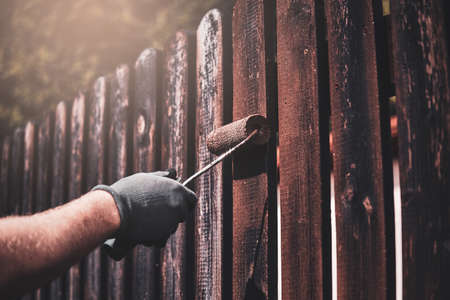 a hand with a paint roller paints an iron fence with brown paint in the garden
