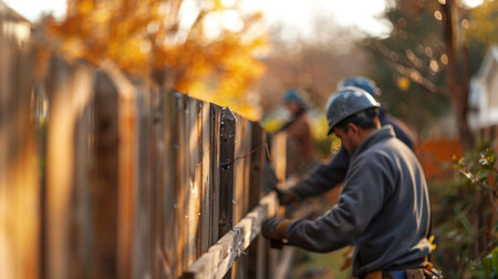 Construction workers actively building a fence in an autumn setting, with leaves falling and vibrant colors around