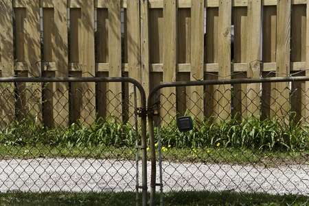 Wooden Fence Door View with Weathered Wall Planks, Old Rusty Hinges