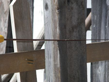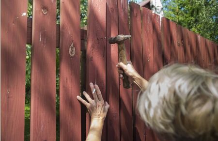Hand holding a hammer impacting a wooden fence, symbolizing maintenance, home improvement, and repair work