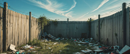 AI Generated. Neglected backyard littered with trash and debris surrounded by wooden fence under clear sky