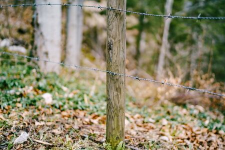 Barbed wire on a wooden fence against a backdrop of yellow leaves in the woods in March