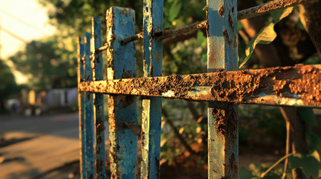 A close-up of a weathered metal fence showing rust and chipped blue paint, beautifully illuminated by natural light during sunset, adding a serene ambiance.