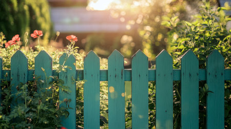 A charming wooden fence in a vibrant garden setting showcases beautiful red flowers highlighted by soft golden sunlight, creating a serene outdoor atmosphere.