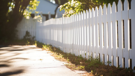 A charming rustic white wooden fence stands in a sunlit garden, surrounded by colorful wildflowers, evoking a serene countryside atmosphere.
