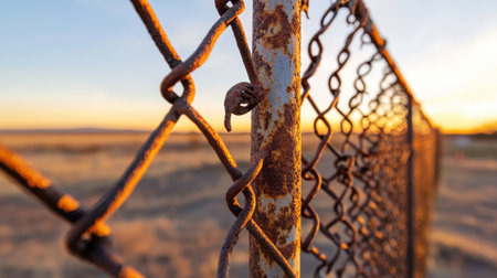 Close-up of rust-covered metal fence glowing in warm sunset light, texture rich with decay