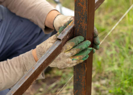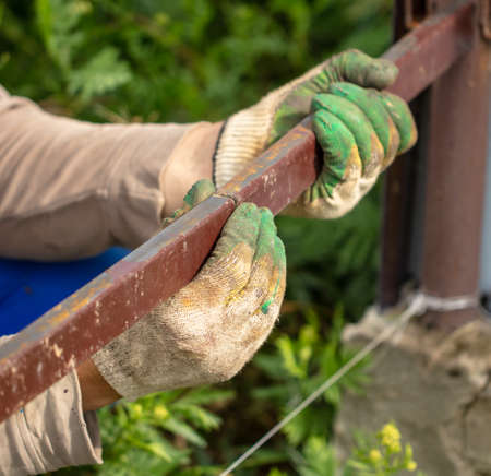 Closeup of the hands of a blue collar worker from Latin America unsafe welding a metal fence