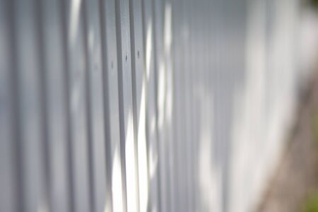 A close-up shot captures a weathered brick wall and black metal fence, casting shadows on the adjacent sidewalk. The composition features a blurred background, suggesting a residential street. The image could be suitable for architectural, urban, or lifestyle content, or used as a background.