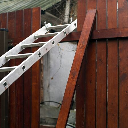 Collapsed aged wooden fence near new lumber boards installation of suburban residential house