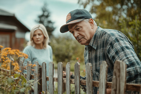 An elderly man examines a wooden fence in a garden as a woman watches, both dressed for a casual outdoor day.