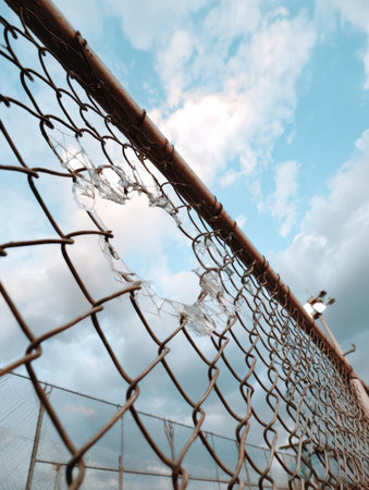 A chain link fence shows a gap with glass shards visible, set against a backdrop of clouds during the evening light near a sports area.