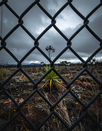 Peering through the cold metal of a chain-link fence, a solitary tree stands as a symbol of resilience against a dramatic, overcast sky.
