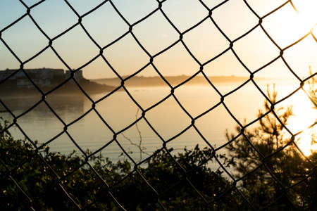 metal mesh fence. sea at sunset behind the net. restraint of liberty
