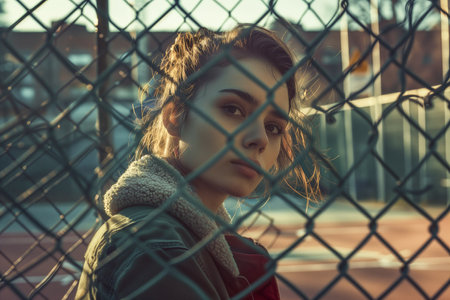 A woman with long hair is looking out of a fence. The fence is made of metal and is open. The woman's face is visible, and she is looking at something outside