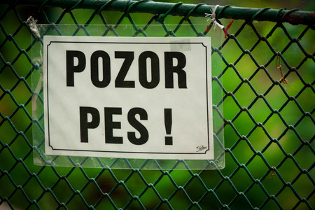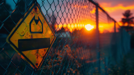 Caution sign with a warning triangle against a sunset backdrop, seen through a chain-link fence.