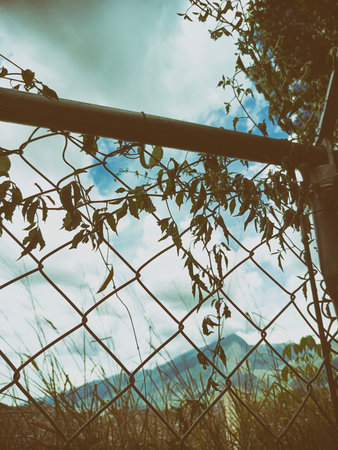blue sky with clouds and chain link fence - retro vintage effect style pictures