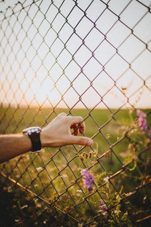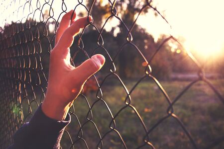 Young man hand holding on chain link fence for freedom, Human Rights Day, immigrant concept.