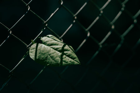 Heart shaped green leaves beautiful in steel grille with dark background.
