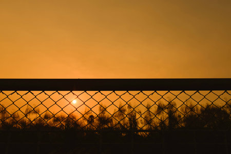 A chain link fence stands tall as the sun rises illuminating the surrounding area with soft light.