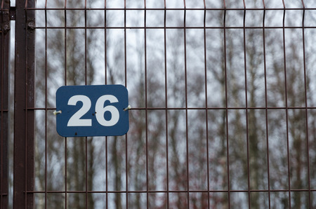 Blue rectangular plate with white number 26. The plate is attached to a white fence made of metal mesh. In the background, you can see the crowns of trees without leaves. Background. Texture.