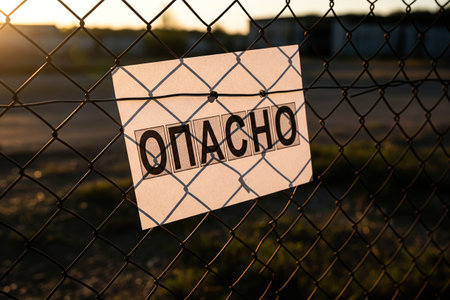 Russian warning sign DANGER attached to a chain-link fence during golden hour sunset light, strong shadows, Russia