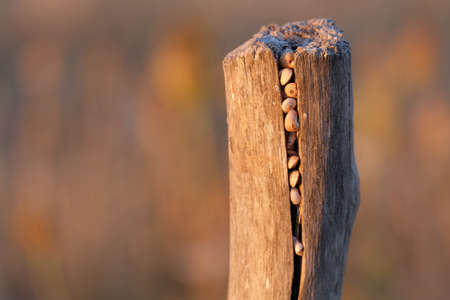 Snails hidden into a pole at sunset. The colours are orange, purple