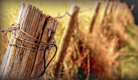 Close up of barbed wire on a old rotten fence in the countryside.