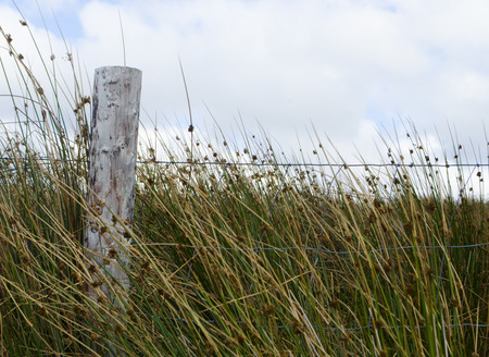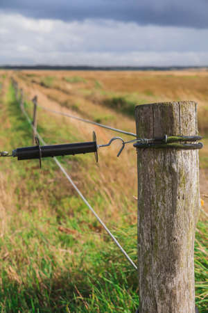 A fence with barbed wire and a wooden post with a view over the landscape of the Wadden island of Texel on the dutch Wadden sea, Holland