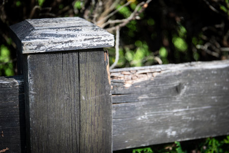 Weathered Wooden Fence Post with Peeling Paint in Natural Outdoor Setting