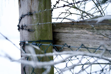 Detail of a frozen iron fence on a wooden pole during the winter in Czech republic.