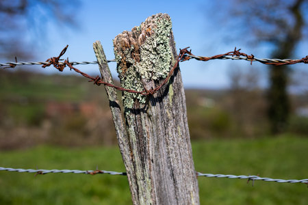 detail of barbed wire fence with wooden pole in the field