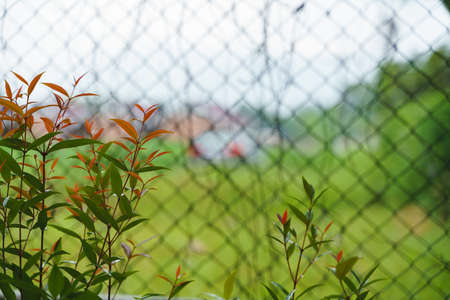 Mesh cage in the garden with green grass as background. Metal fence with wire mesh. Blurred view of the countryside. abstract background.