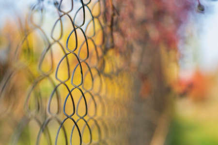 Wire fence mesh pattern. Close up shot, shallow depth of field, dim evening sunset light, no people.